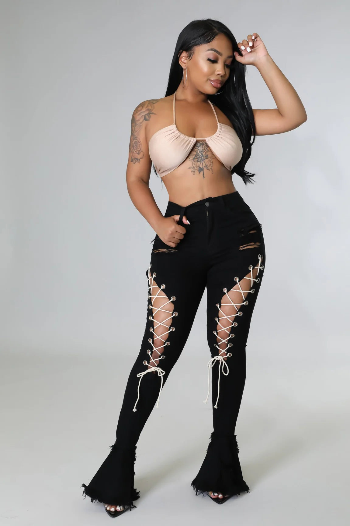 Turn heads with the Pretty Flare jeans, designed for those who embrace bold style. Featuring daring distressed details and a provocative lace-up front, these stretch jeans sculpt your figure while adding edge. The dramatic flare bottoms create a striking silhouette, complemented by a secure button zipper closure. Made from a comfortable blend of cotton, polyester, rayon, and spandex, they offer flexibility and durability. With functional pockets and easy hand wash care, these jeans are your go-to for fearless fashion. Keep it KT!